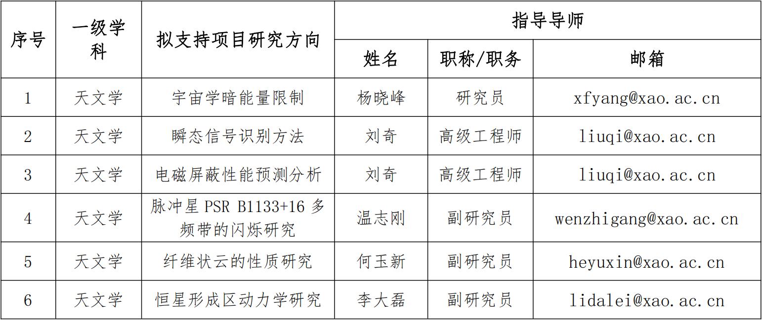 中科院新疆天文台现开展2021年大学生“科创计划”项目申报工作,“科创计划”项目指南详见下表。在校大学生可根据自己的专业兴趣,选择相应项目和指导教师(在申请学生本校可设共同指导教师)。有意向的学生在与项目指导教师充分沟通后,登录蜜桃导航科教结合协同育人行动计划(http://kjxt.ucas.ac.cn/index.php/zh/ ),选择“科创计划”进行注册,然后在网上进行项目填报,请注意随时保存信息。全部填报完毕并确认无误后,点击提交,下载并打印申请表,请学籍所在学校(或学院)签字盖章后寄至项目设立导师,导师签字同意后交天文台研究生部。